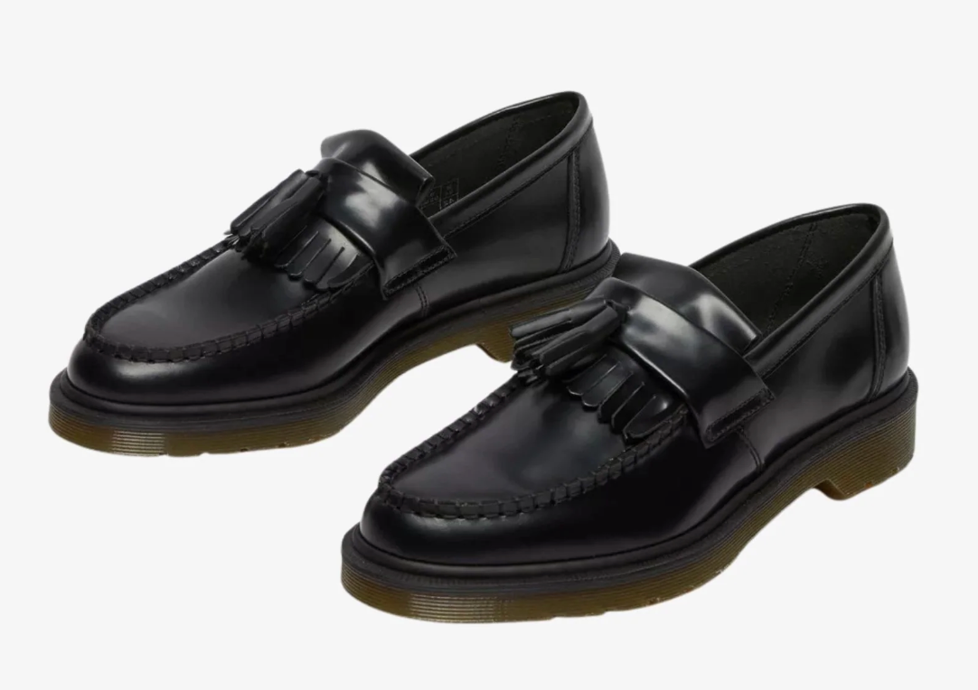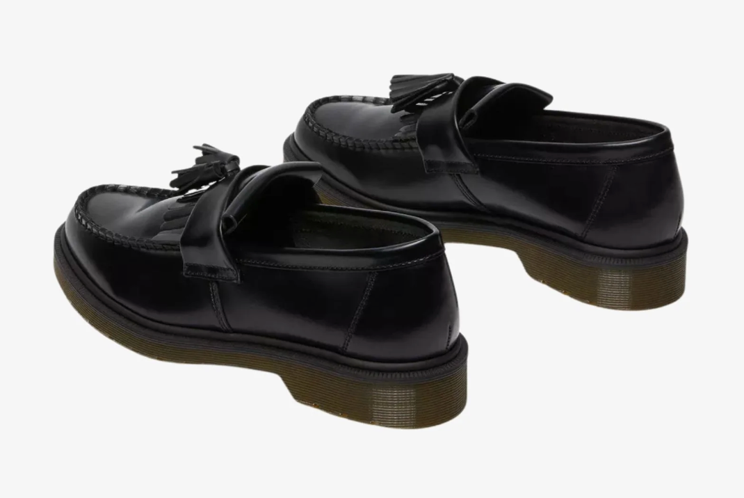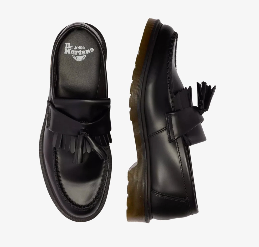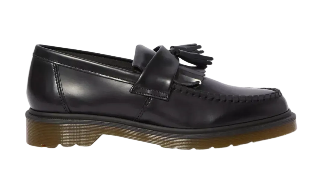 The Dr. Martens Adrian Tassel Loafer Black PSMTH blends classic loafer styling with the unmistakable attitude of Docs. Crafted from high-shine Polished Smooth leather, this slip-on silhouette features double tassels and a kiltie fringe for a refined, rebellious edge. Set atop the iconic AirWair™ sole and finished with yellow stitching, it's a timeless staple with street-ready presence.