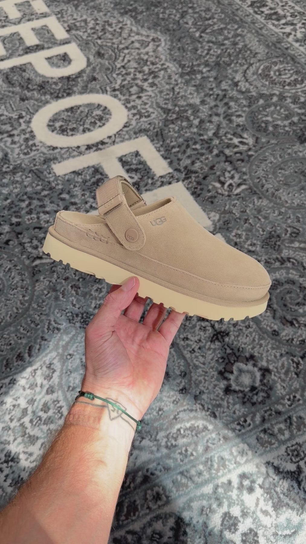 The UGG Goldenstar Clog in Sand delivers effortless comfort with a casual, contemporary vibe. Designed with a sleek slip-on silhouette, this modern clog features a suede upper in a warm Sand tone and a cushioned EVA sole for lightweight wear. With its adjustable heel strap, you can choose between open-back convenience or extra stability, making it ideal for all-day outings or relaxed weekends.